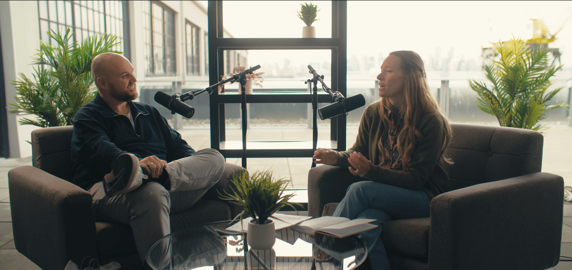 Charlie Grinnell (left) and Guest Host Rachel Thexton (right) recording the Marketing News Canada podcast live at SocialPacific 2025